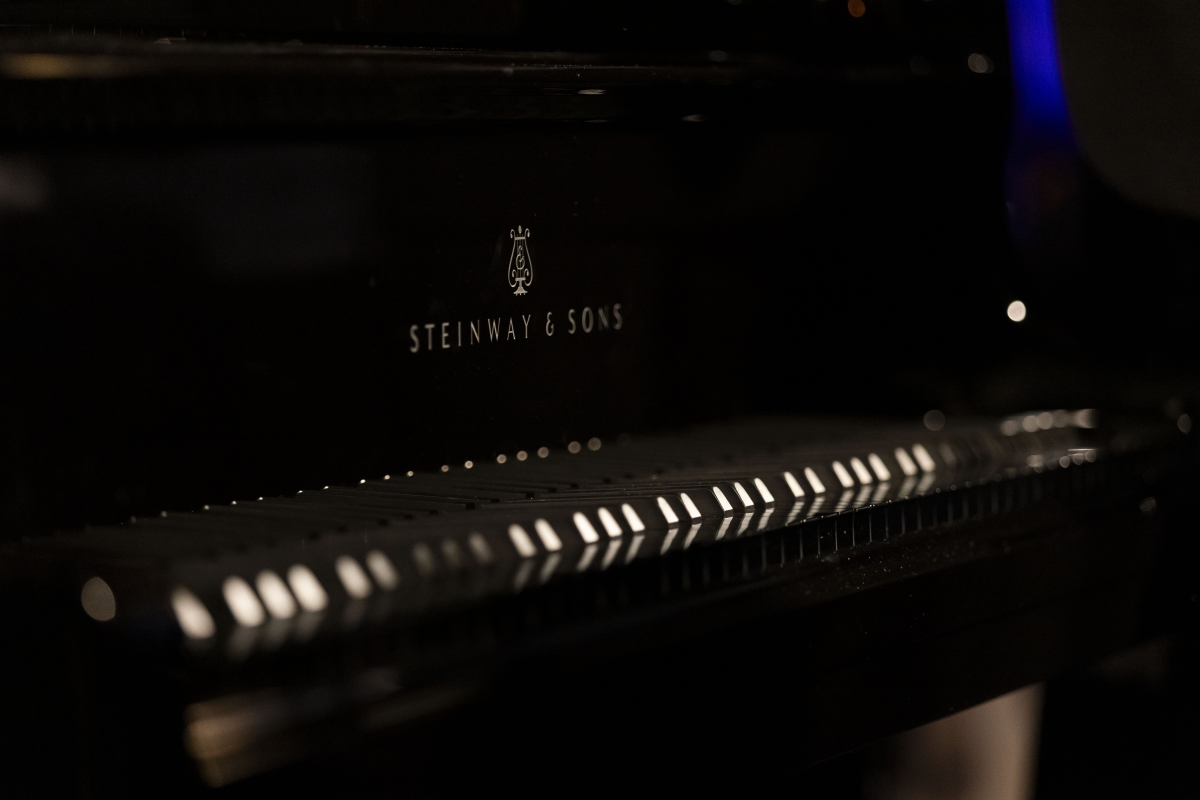 Le finiture in metallo PVD estendono le sfumature di nero con una sottile lucentezza, mentre il logo Steinway inciso sul coperchio è l'unica marcatura visibile, lasciando i lati completamente lisci.