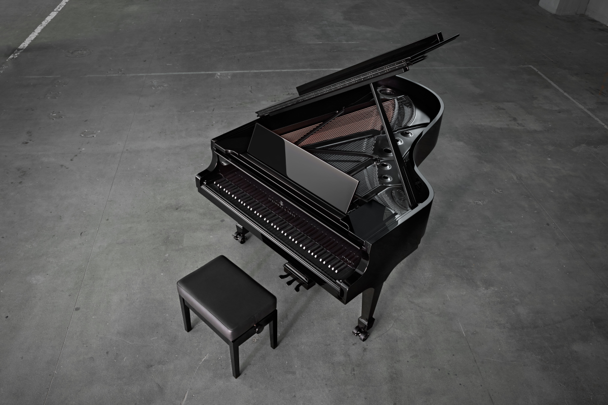 Dalla tinta di nero della parte inferiore dello strumento alla tavola armonica e alla piastra in ghisa entrambe verniciate in Liquid Black Yellow, il pianoforte esprime la sua identità monocromatica in ogni dettaglio.
